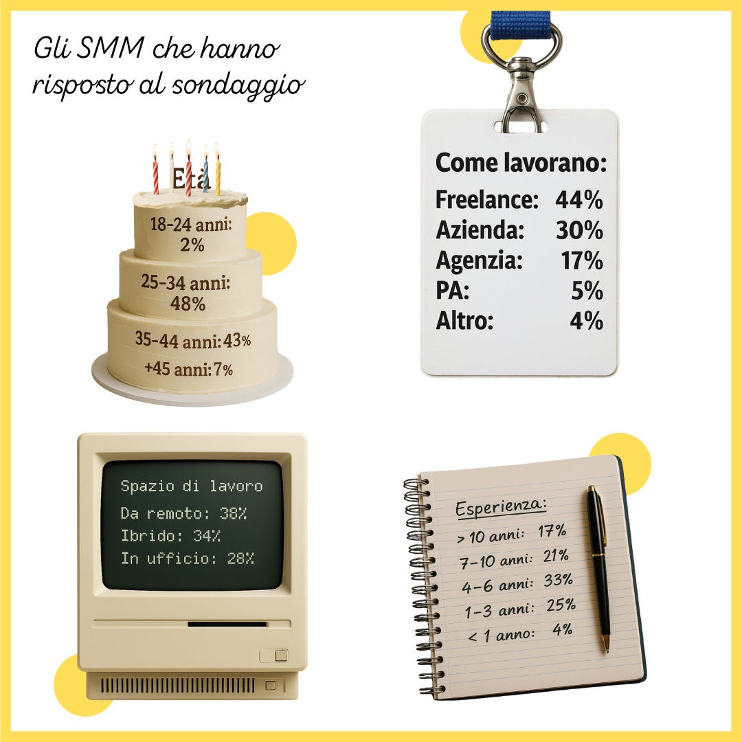 Per l’occasione negli ultimi mesi ho rielaborato i dati del sondaggio lanciato a inizio anno in modo da scattare una piccola fotografia dello stato dell'arte del mestiere del SMM in Italia.